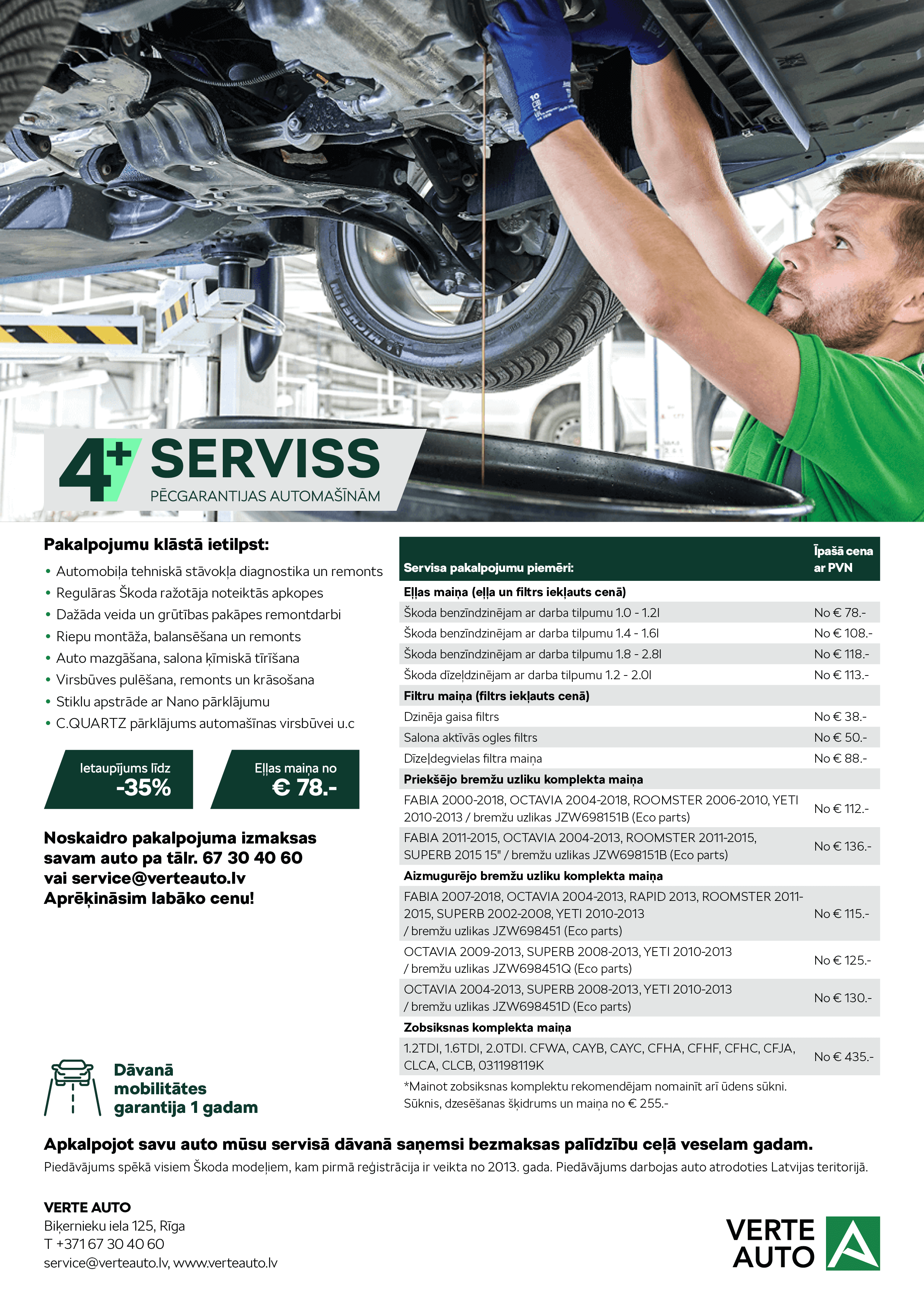 Uzklausot mūsu klientu vajadzības, mēs, Škoda auto dīleris Verte Auto, esam izveidojuši īpašu programmu - Servisu 4+, kas ir radīts lai Tavs četrus, piecus vai pat desmit gadus vecais auto vienmēr būtu drošs, uzticams un saglabātu savu vērtību, turklāt – par pieejamām cenām!