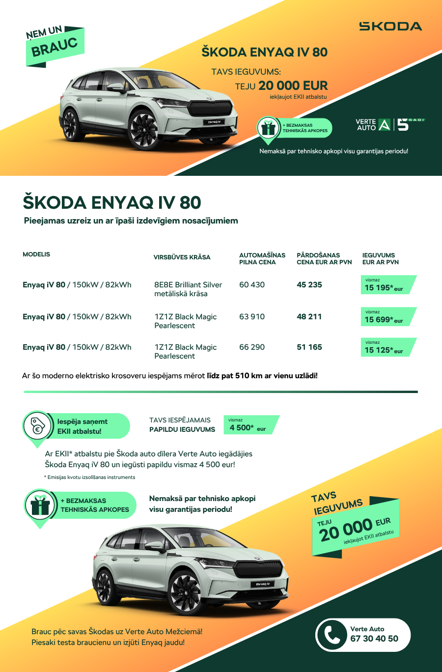 Škoda auto dīleris Verte Auto pašlaik piedāvā Enyaq iV 80 par īpaši izdevīgu cenu – sākot no 45 235 eiro, kas ir ievērojami mazāk nekā šī modeļa standarta cena – 60 430 eiro. Tas nozīmē, ka jau iegādes brīdī Tu iegūsi vairāk nekā 15 000 eiro! Turklāt, piesakoties arī valsts līdzfinansējumam no EKII programmas, Tu varēsi saņemt vēl vismaz 4 500 eiro atbalstu.